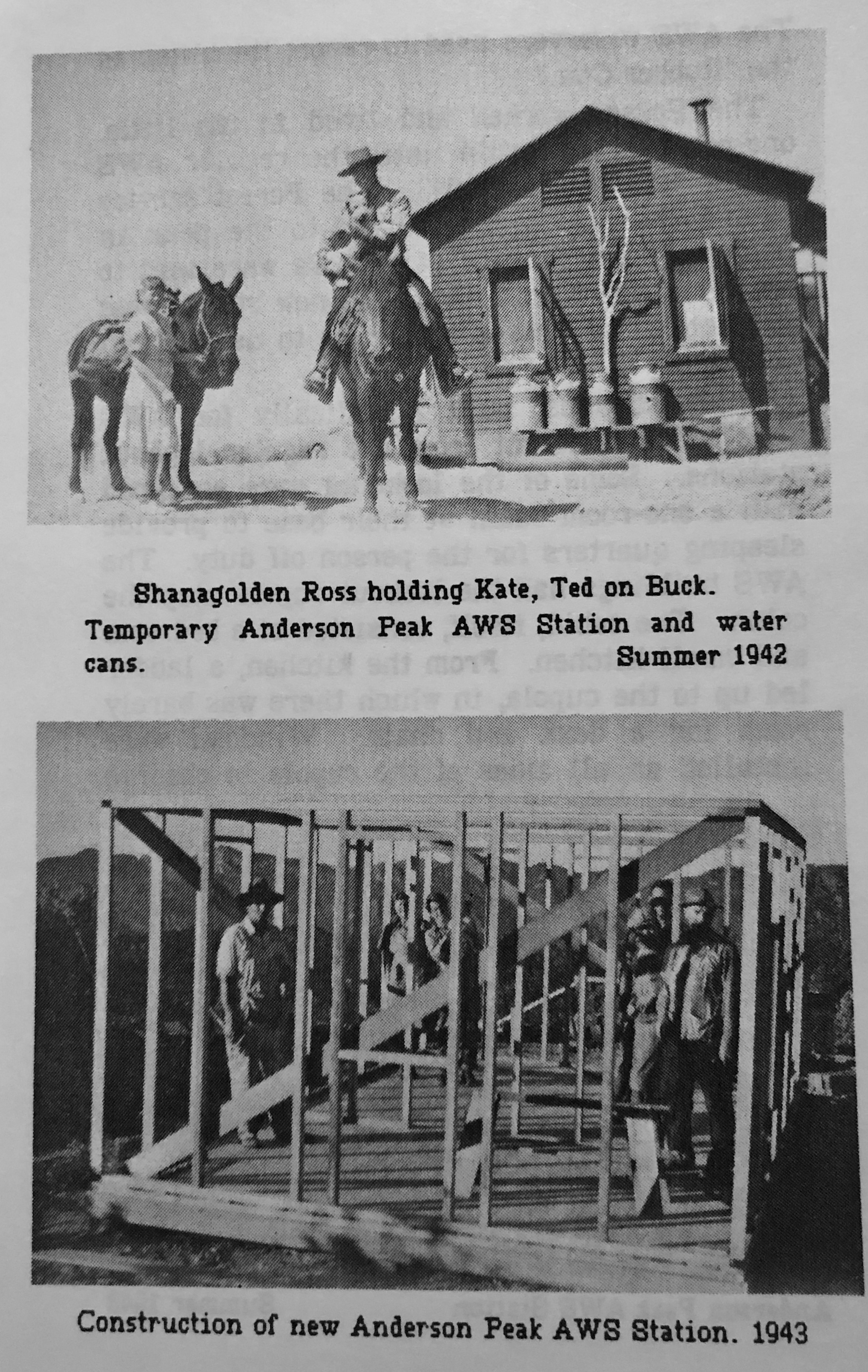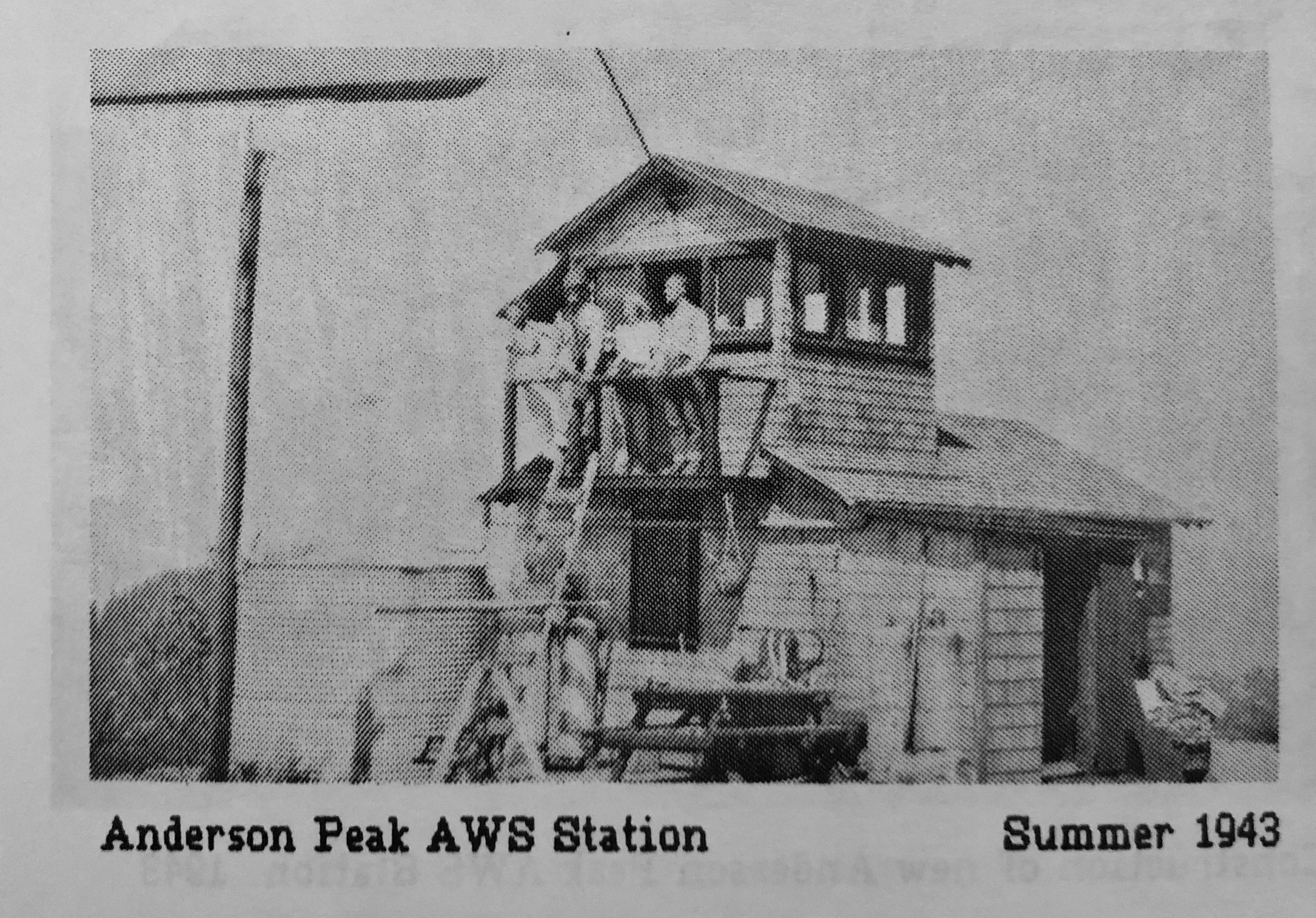 Anderson Peak Lookout was a dual purpose site, used for enemy aircraft spotting and fire detection. A small, single story peak roof building was erected and staffed in mid-1942 by Harry and Lillian Ross. A standard AWS post structure with a ground cabin and cupola were constructed and replaced the original building in 1943.