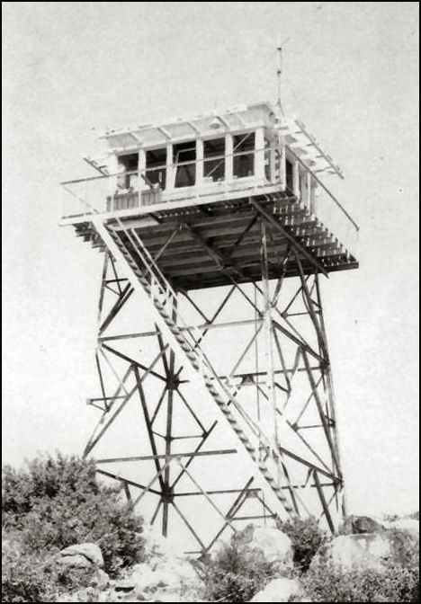 A 10' non-battered enclosed timber tower with a Region 5 4A 14'x14' live in wood cab was constructed here in 1918. This was replaced in the 1930's with an L-1600 Series 30' steel K-Brace tower with a Region 5 BC-301 design 14'x14' live in wood cab.
