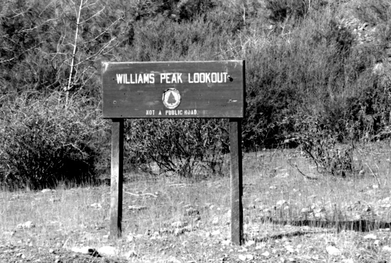 Williams Peak is based closely on the L-101 design. Nonbattered, enclosed timber towers (NETTs) weren't as frequently erected by the CCC as the BETT designs. Attrition of this tower type has also been high. When Hayden Hill is removed, this will be the last L-1 in the CDF&FP detection system. The catwalk revision is shown in CDF Plan Number 155. The tower sits upon a rocky peak, a short distance above the parking area. (MVT 10-91)