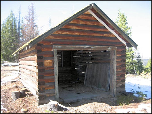 The first Beartrap Lookout on the Salmon National Forestwas a log cabin built in 1919. In 1935 this L-4 with catwalk on a log crib was built.