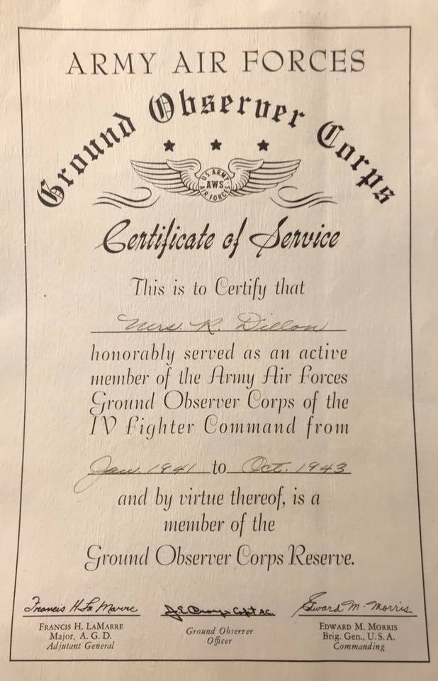 Currently on display at the Corona Heritage Museum are items donated by the Dillon family that once belonged to Helen Dillon who was a Corona volunteer that donated her time to man the aircraft watchtower.