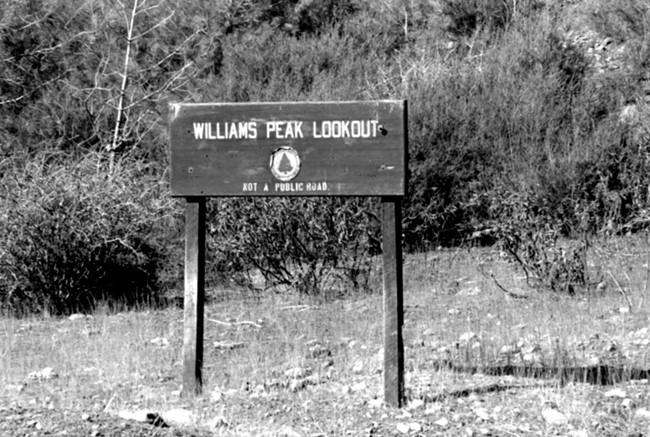 Williams Peak is based closely on the L-101 design. Nonbattered, enclosed timber towers (NETTs) weren't as frequently erected by the CCC as the BETT designs. Attrition of this tower type has also been high. When Hayden Hill is removed, this will be the last L-1 in the CDF&FP detection system. The catwalk revision is shown in CDF Plan Number 155. The tower sits upon a rocky peak, a short distance above the parking area. (MVT 10-91)