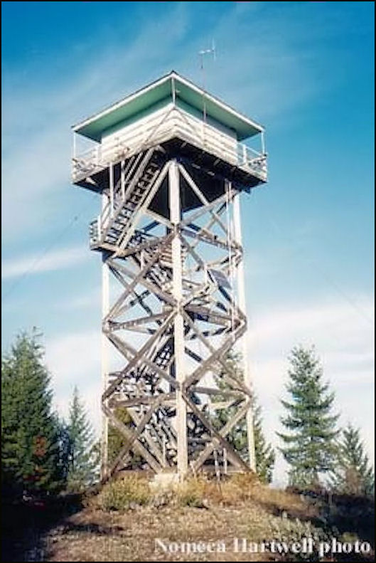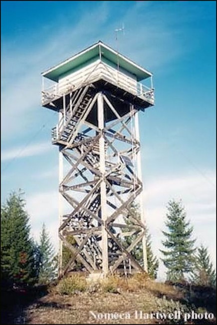 The first lookout on this site was a camp and tree platform built in the 1920s. A 40' L-4 tower replaced it in 1933. That tower was replaced in 1961 with a 41' treated timber tower with an ODF live-in cab. Structure inspections revealed dry rot in the tower, resulting in it being burned to the ground November 20, 2006.