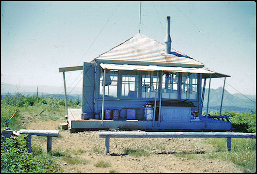 In 1952, the lookout was freshly painted by Fire Warden Richard Spray and his crew. The lady on the right was the lookout.