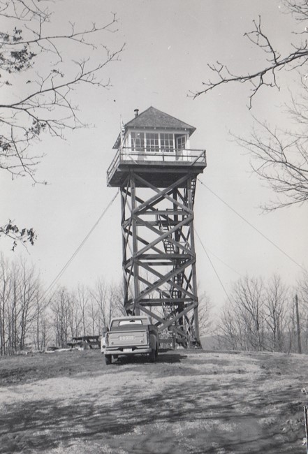 Allen Field Tower was a 50-foot four-legged wooden tower capped with a cabin.